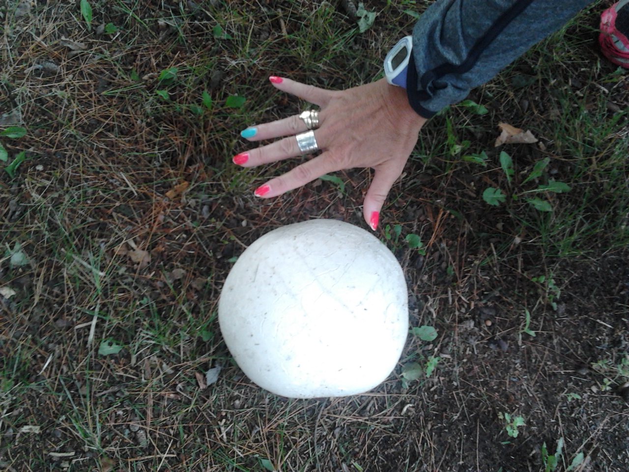 It was another interesting run this morning. We were running along, chatting about the weekend when I noticed a large white ball to our left. There was something about the color of it that made me go have a look. It was a puffball mushroom a little bigger than a hand.
