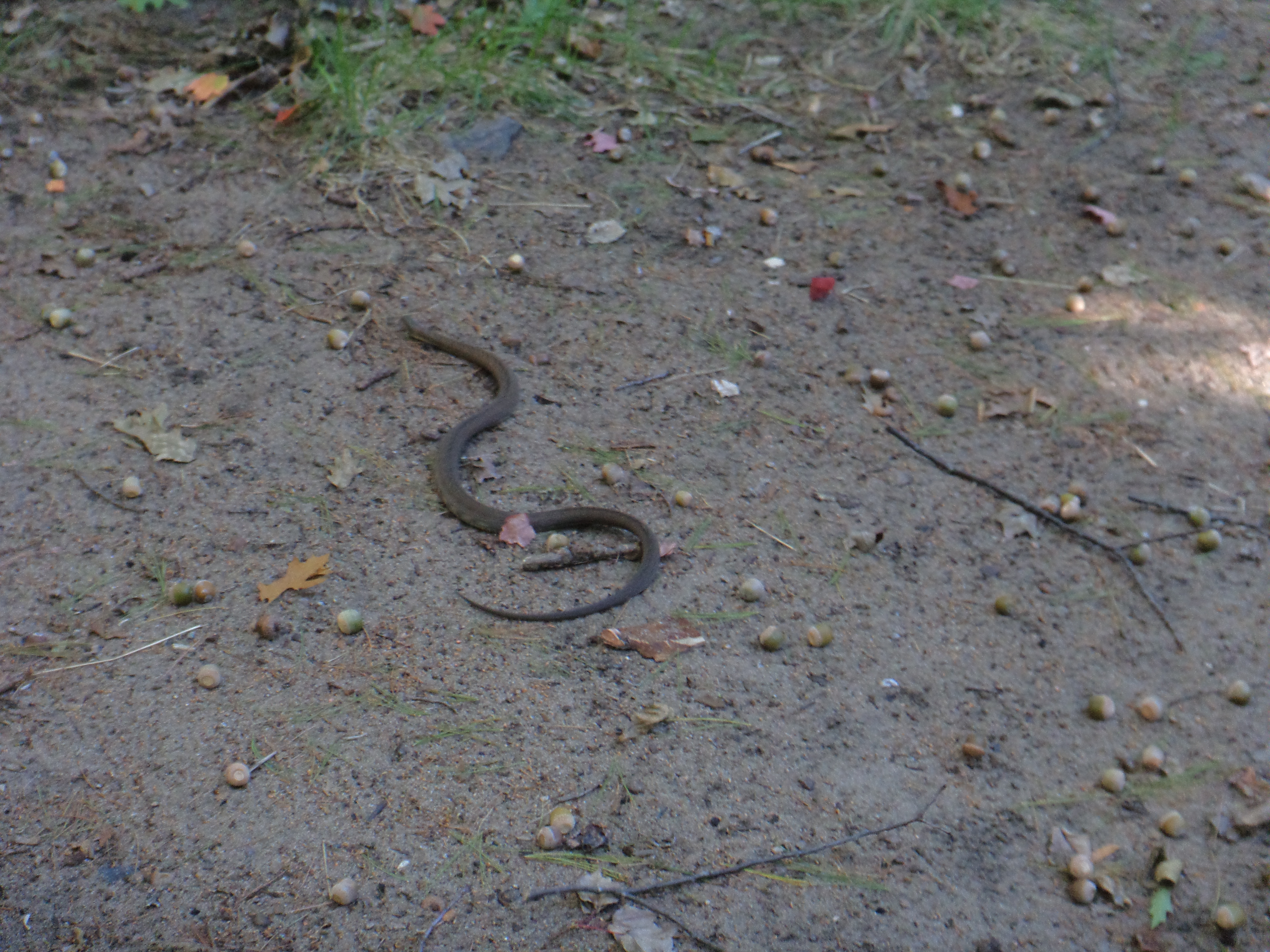 Our “anaconda” size snake slithered around into our site, at a lazy pace and stretched right out as it slithered over towards the bush beside the site. (I checked at that point for a rattle on its tail but there wasn’t one.) At one point it picked up the pace and whipped along, disappearing into the weeds beside the creek at the back of our site. Too Cool! He had to be about 3 feet long with a small head and a rather plump body.