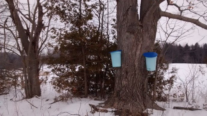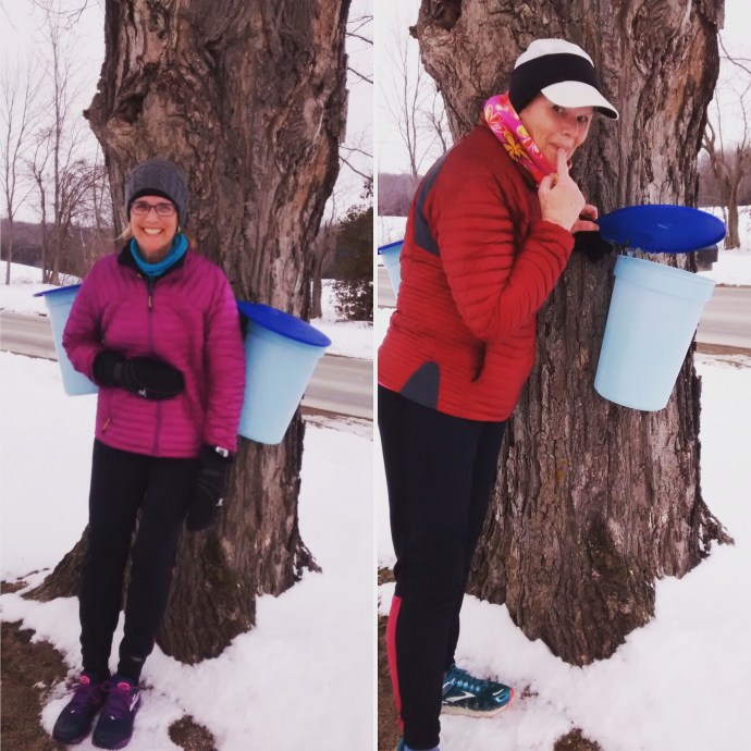 Winter is passing and cold nights and bright sunny days can only mean it’s Maple Syrup time!  On our run this morning we came across trees tapped along the back road.